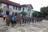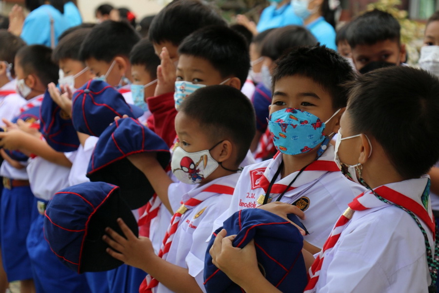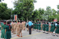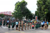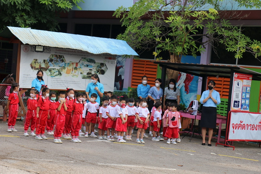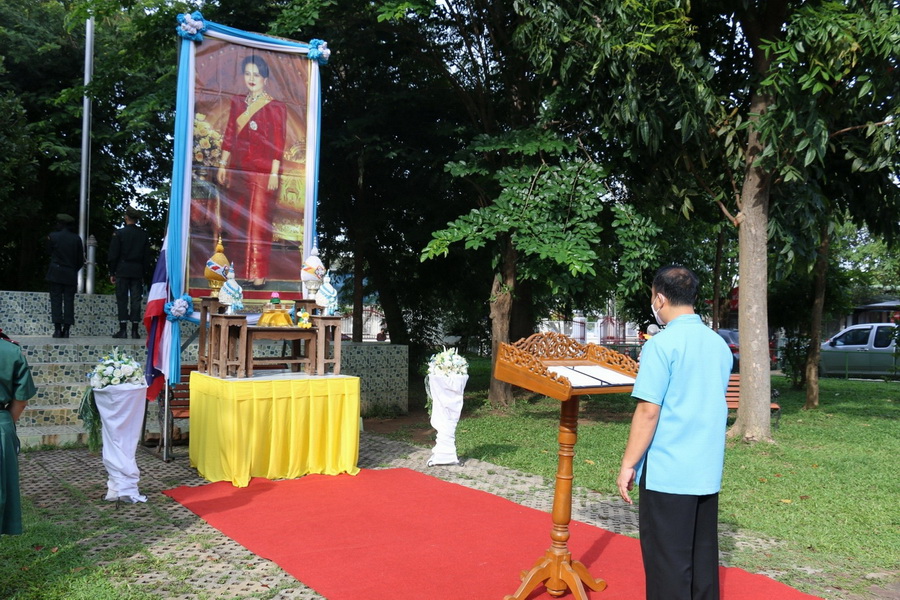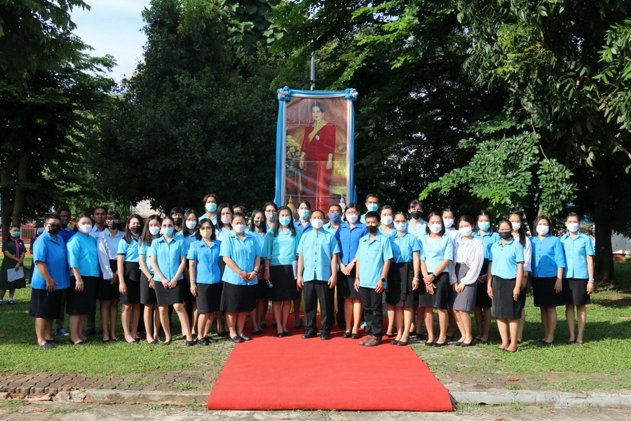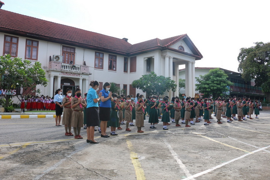 คณะครูและนักเรียนร่วมขับร้องเพลง สรรเสริญพระบารมี จัดกิจกรรม ณ บริเวณเสาธง
