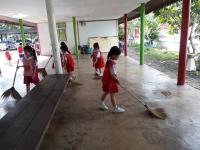 และนักเรียนร่มกันทำกิจกรรมบำเพ็ญประโยชน์หน้าอาคารเรียนปฐมวัย เมื่อวันที่