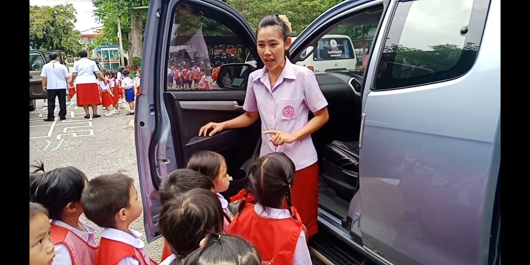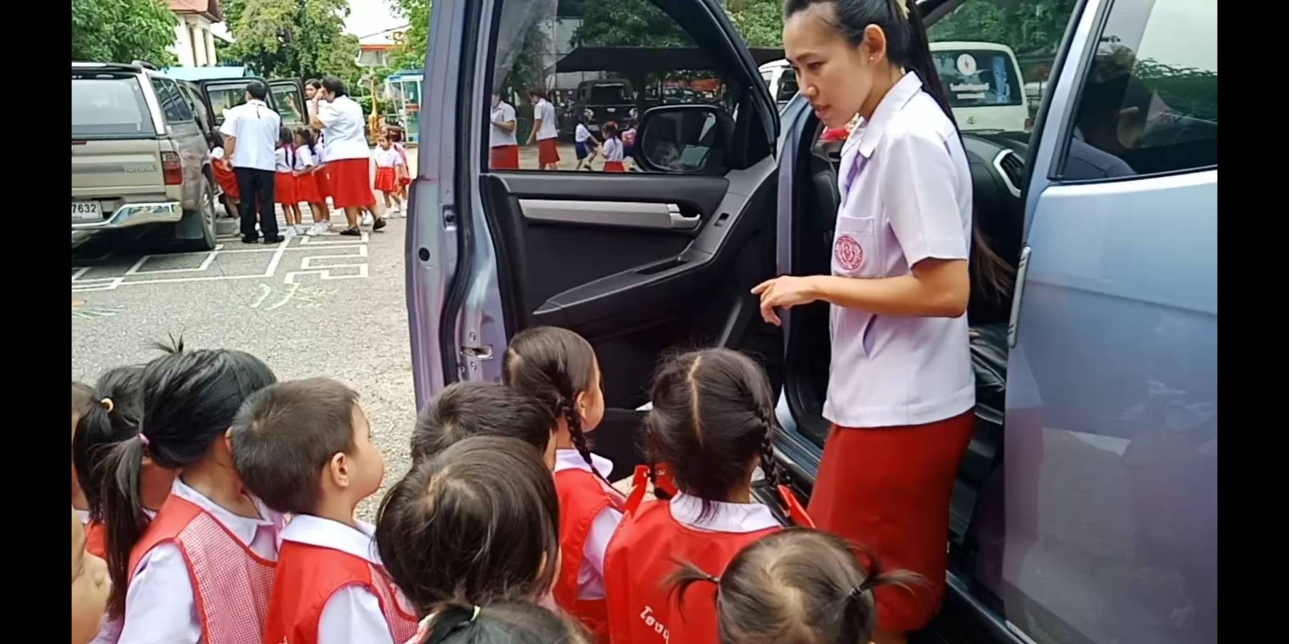 และคณะครูพานักเรียนเรียนรู้และชมการสาธิตในการป้องกันภัยที่เกิดจากการโดยสารจากรถยนต์
