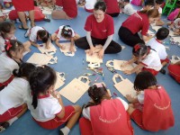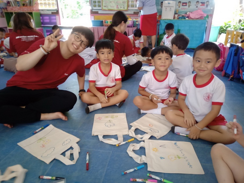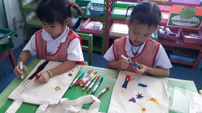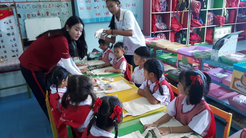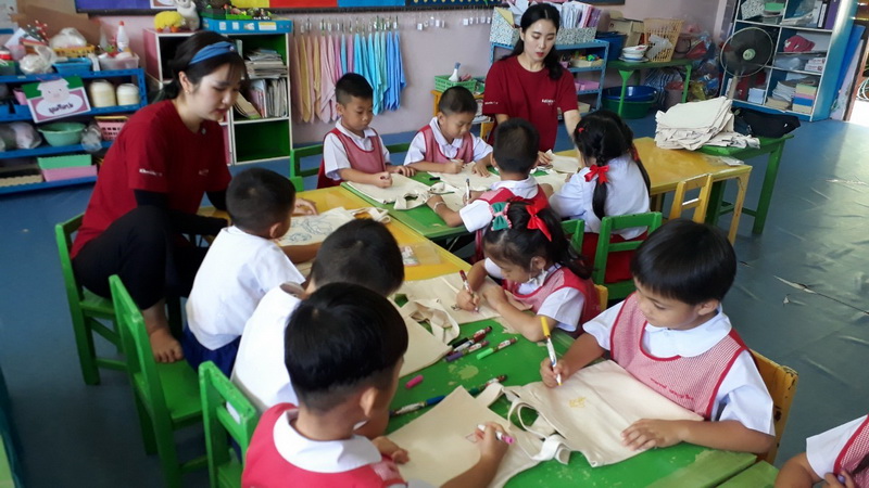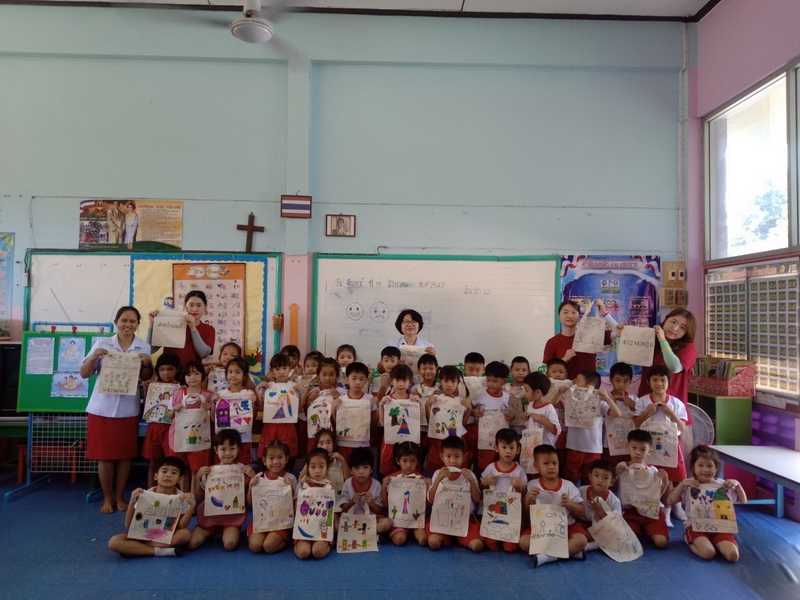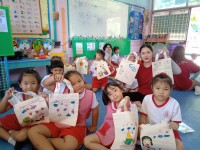 ได้มาจัดกิจกรรมวาดภาพบนกระเป๋าผ้าให้กับนักเรียนตั้งแต่ระดับชั้นอนุบาล 1- 3 และแจกของที่ระลึกให้กับนักเรียนทุกคน