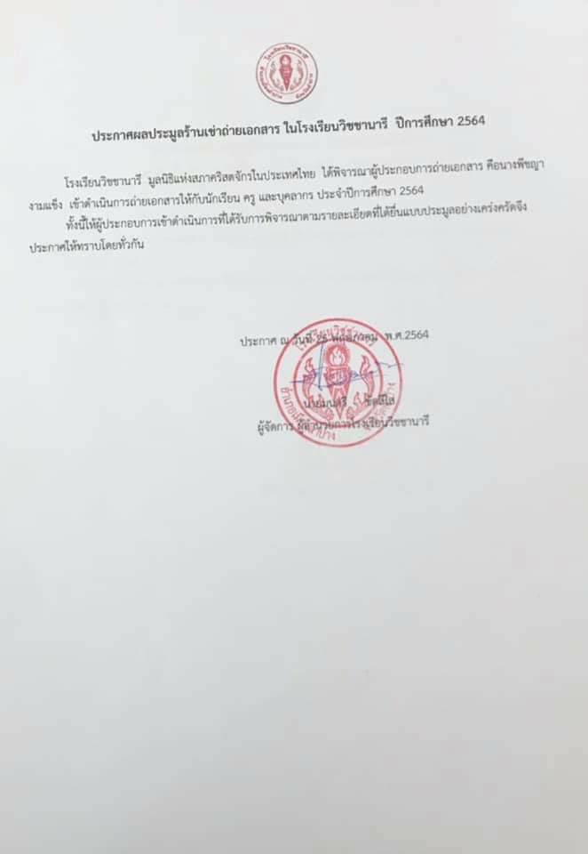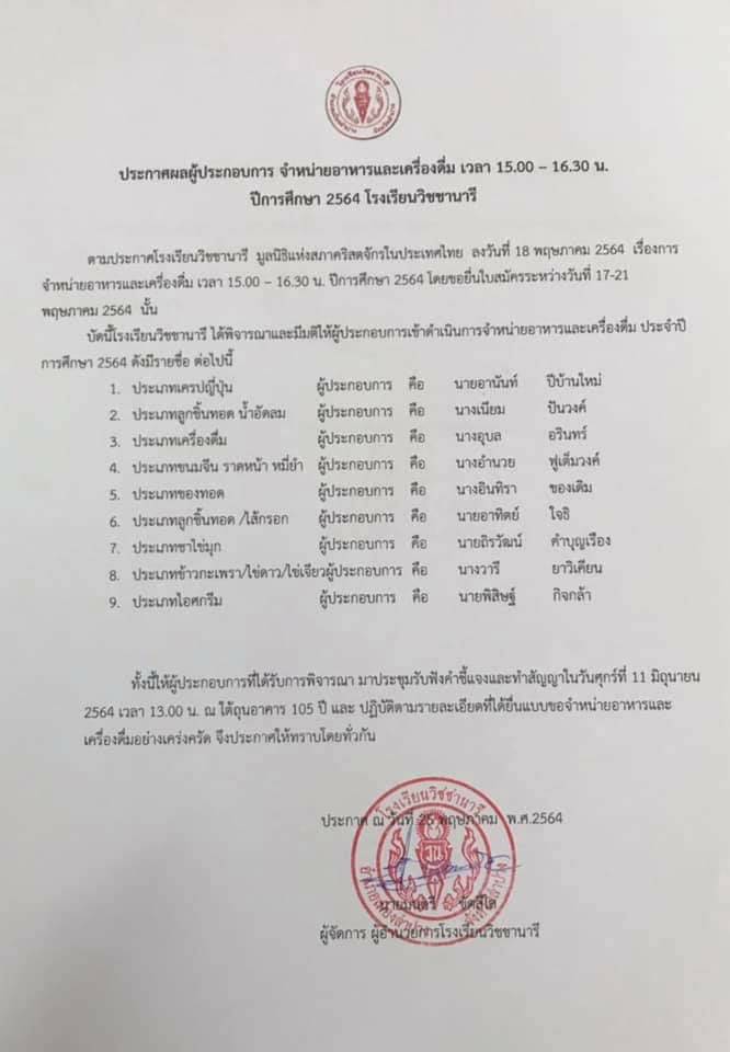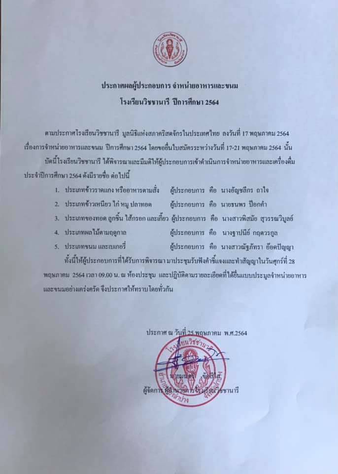 ประกาศผล การประมูลผู้ประกอบการอาหารกลางวันนักเรียน ประมูลผู้จำหน่ายอาหารและขนม และประมูลร้านเช่าถ่ายเอกสารในโรงเรียน ประจำปีการศึกษา 2564