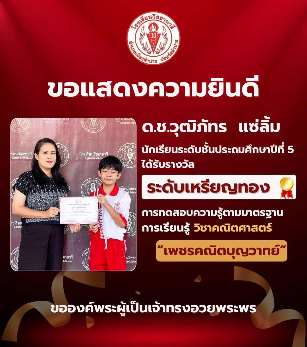 โรงเรียนวิชชานารี ขอแสดงความยินดีกับ ด.ช.วุฒิภัทร แซ่ลิ้ม นักเรียนระดับชั้นประถมศึกษาปีที่ 5 ได้รับรางวัล ระดับเหรียญทอง การทดสอบความรู้ตามมาตรฐานการเรียนรู้ วิชาคณิตศาสตร์ “เพชรคณิตบุญวาทย์”