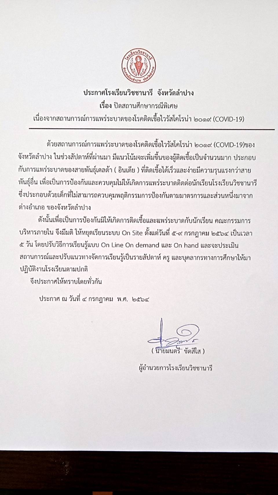 ประกาศโรงเรียนวิชชานารี เรื่อง ปิดสถานศึกษากรณีพิเศษ เนื่องจากสถานการณ์การแพร่ระบาดของโรคติดเชื้อไวรัสโคโรน่า 2019 (โควิด-19)