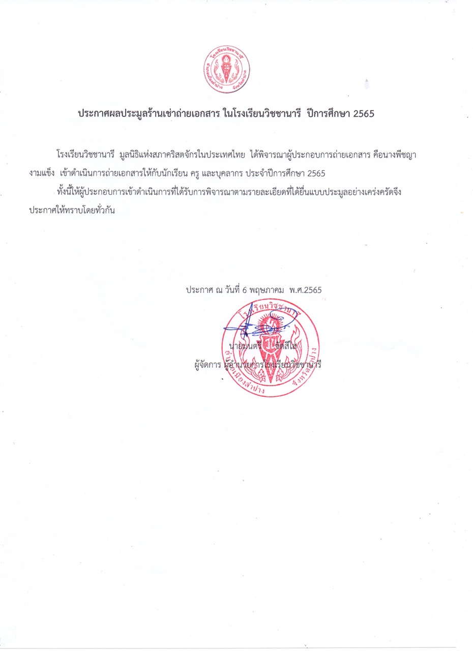 ประกาศผลประมูลร้านเช่าถ่ายเอกสารในโรงเรียนวิชชานารี