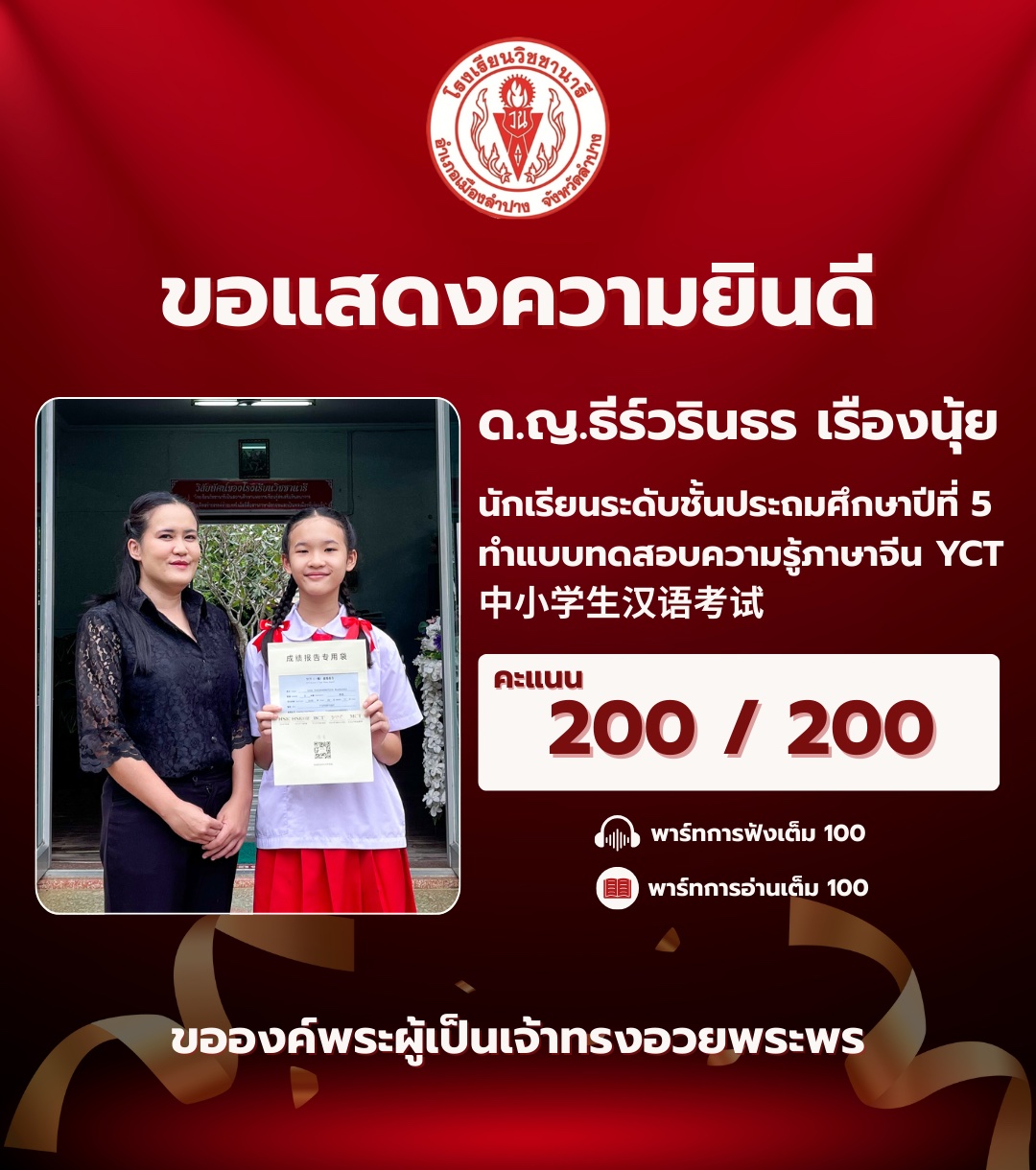 ขอแสดงความยินดีกับ ด.ญ.ธีร์วรินธร เรืองนุ้ย สอบ YCT ได้ 200 คะแนนเต็ม