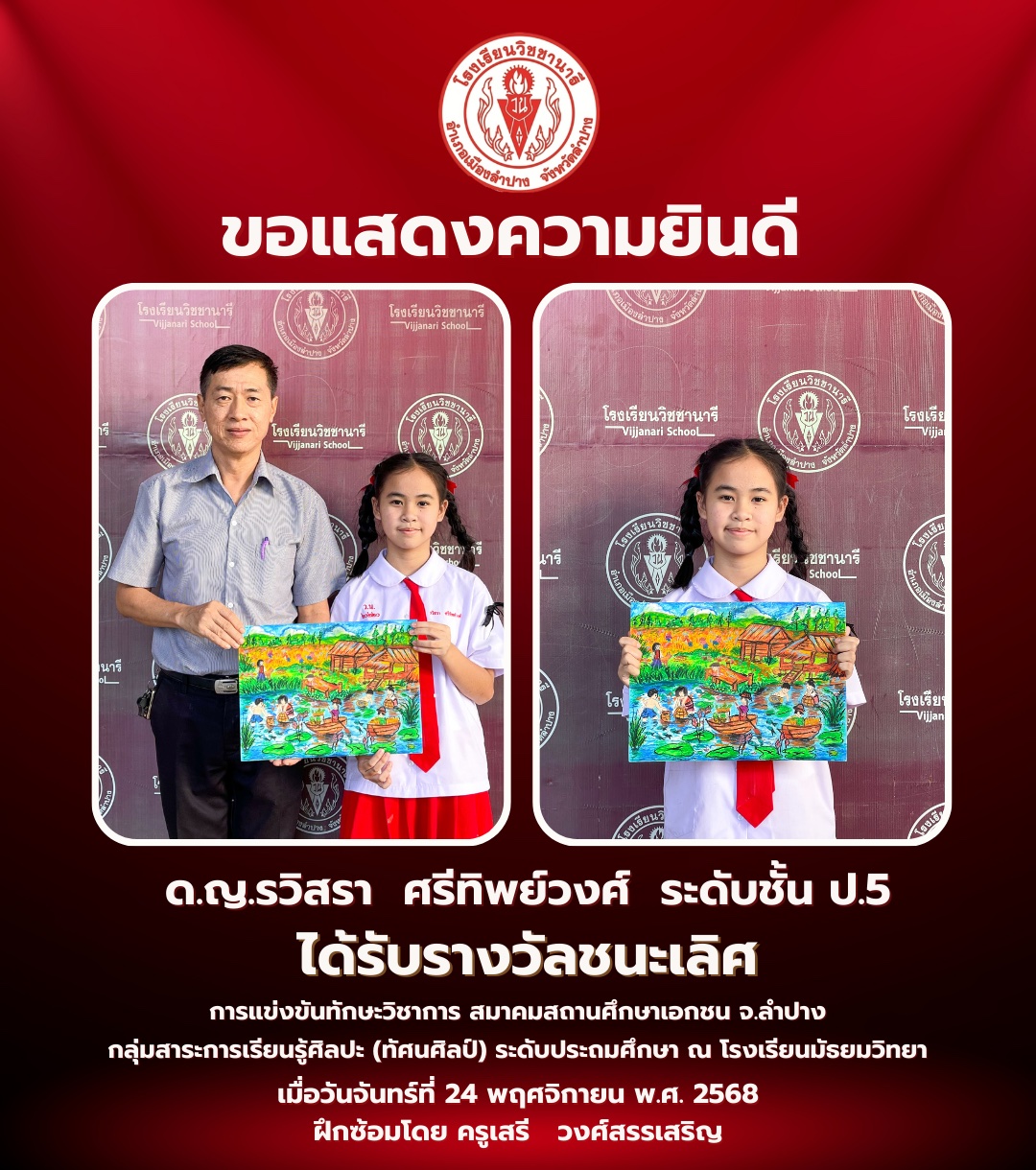 โรงเรียนวิชชานารี ขอแสดงความยินดี กับเด็กหญิงรวิสรา ศรีทิพย์วงศ์ นักเรียนระดับชั้นประถมศึกษาปีที่ 5 คว้ารางวัลชนะเลิศ การแข่งขันทักษะวิชาการ สมาคมสถานศึกษาเอกชน จ.ลำปาง กลุ่มสาระการเรียนรู้ศิลปะ (ทัศนศิลป์) ระดับประถมศึกษา ณ โรงเรียนมัธยมวิทยา เมื่อวันจันทร์ที่ 24 พฤศจิกายน 2568