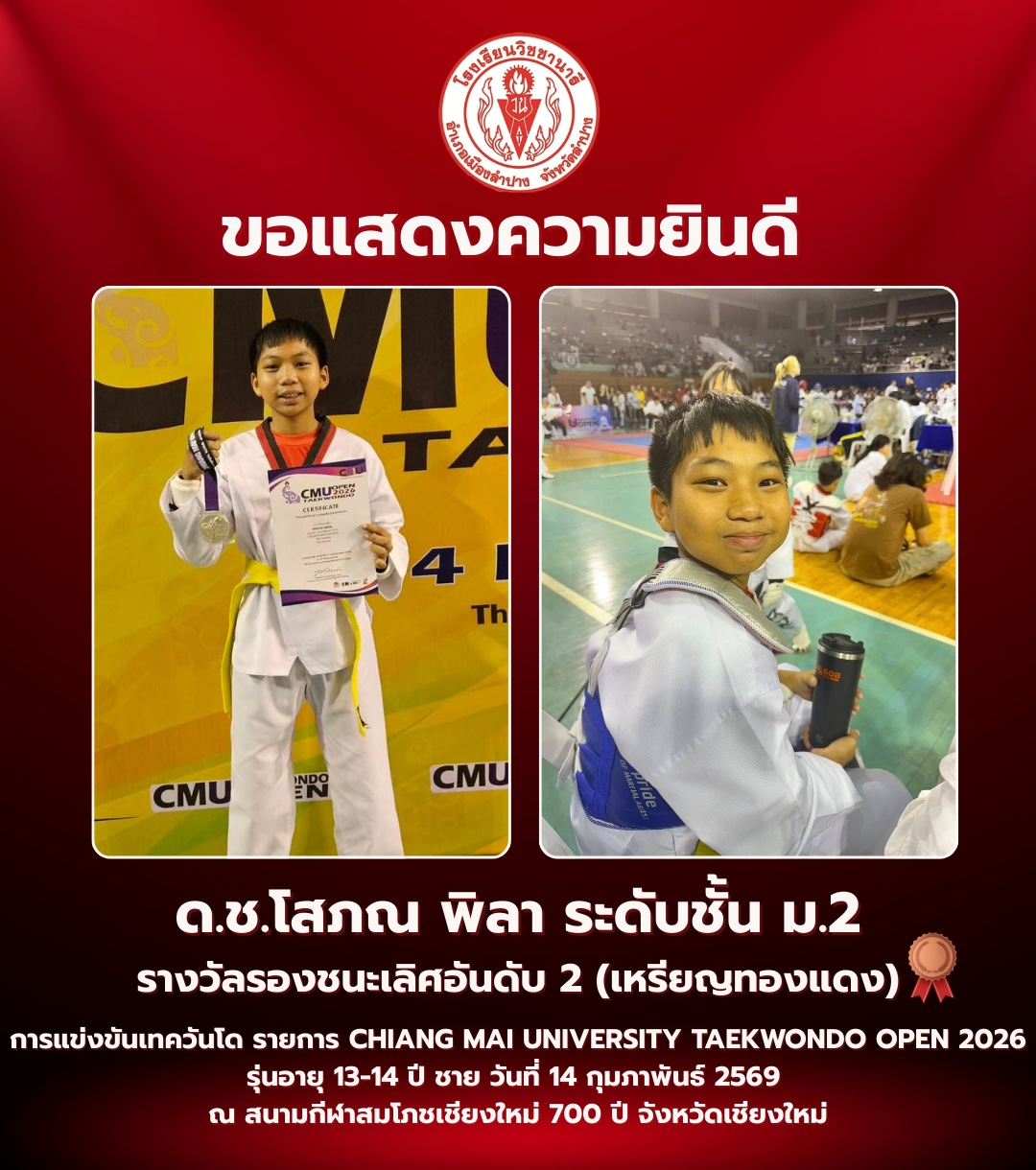 ขอแสดงความยินดี ด.ช.โสภณ พิลา (ม.2) คว้าเหรียญทองแดง การแข่งขันเทควันโด Chiang Mai University Taekwondo Open 2026
