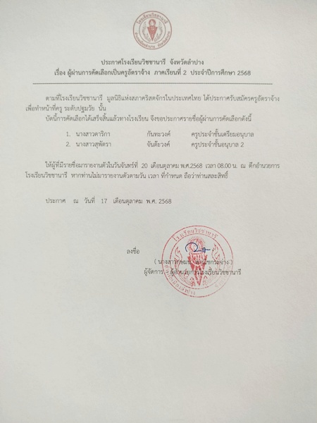 ประกาศผลการคัดเลือกครูปฐมวัย ภาคเรียนที่ 2 ปีการศึกษา 2568