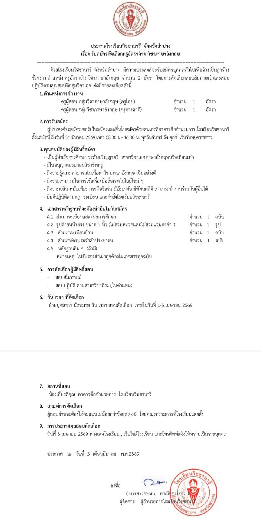 ประกาศรับสมัครครูอัตราจ้าง วิชาภาษาอังกฤษ ประจำปีการศึกษา 2569