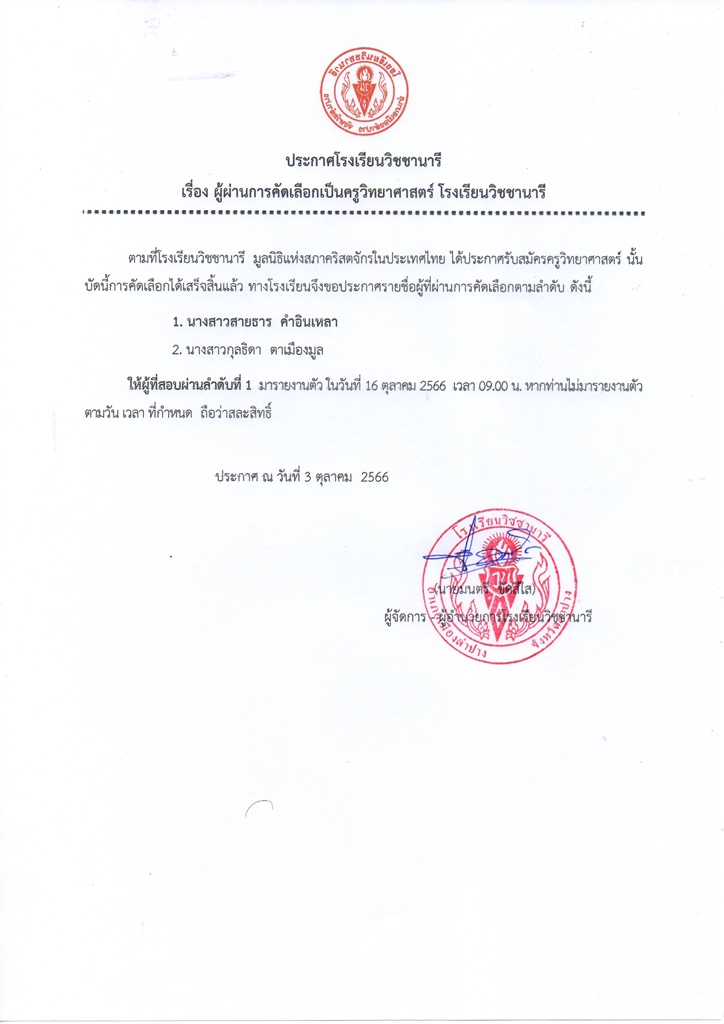 ประกาศเรื่อง ผู้ผ่านการคัดเลือกเป็นครูวิทยาศาสตร์
