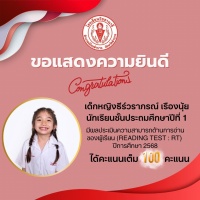 ขอแสดงความยินดี ด.ญ.ธีร์วราภรณ์ เรืองนุ้ย (ป.1) สอบ RT ได้คะแนนเต็ม 100 ปีการศึกษา 2568